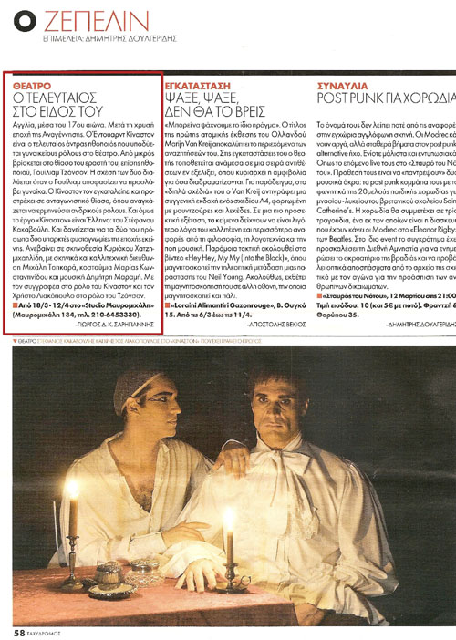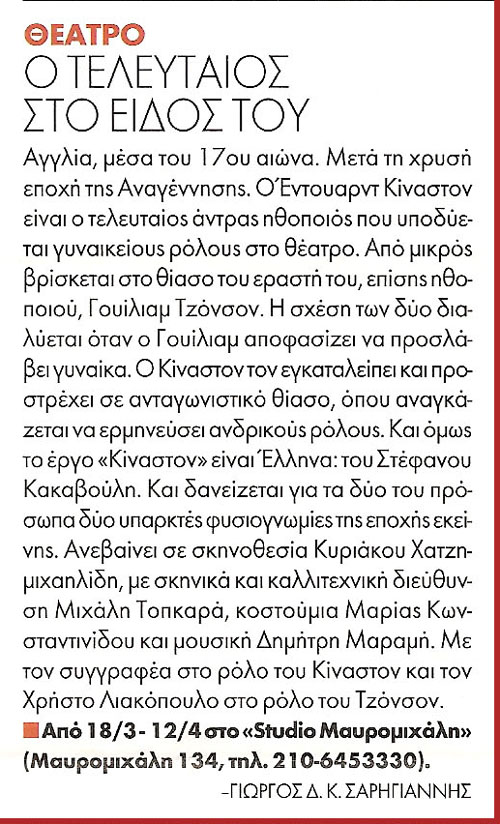 Κύναστον (θεατρική παράσταση), Έγραψαν για την παράστασή μας. Γιώργος Σαρηγιάννης "Τα Νέα, ταχυδρόμος"