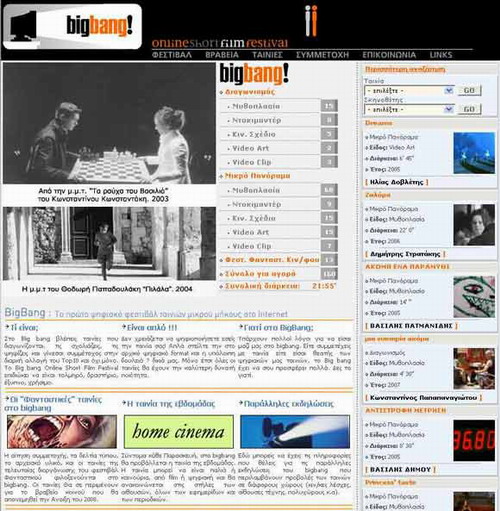 Στο site www.bigbang.gr παρακολουθείτε τις ταινίες και συμμετέχετε στο πρώτο και μοναδικό ψηφιακό φεστιβάλ μικρού μήκους ταινιών του ελληνικού διαδυκτίου.