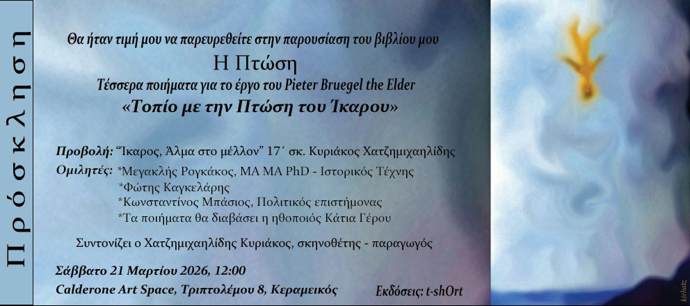 Η καλαίσθητη χαρτόδετη έκδοση (21x14 εκ, 30 σελ.), από την t-shOrt, περιλαμβάνει τέσσερα ποιήματα εμπνευσμένα από τον διάσημο πίνακα «Τοπίο με την πτώση του Ίκαρου» του Pieter Bruegel the Elder, των Wystan Hugh Auden, Michael Hamburger, William Carlos Williams και του ίδιου του Κυριάκου Χατζημιχαηλίδη.