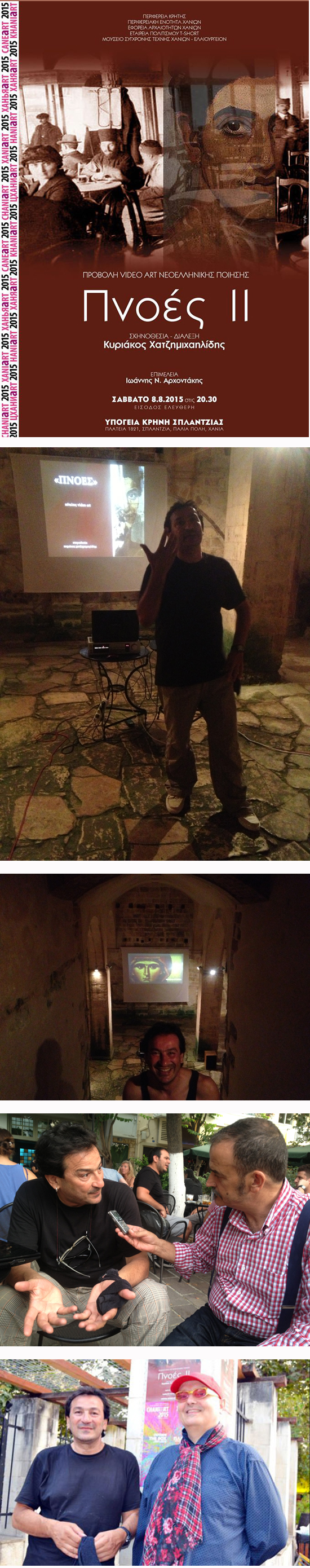 Σε μια ιδιαίτερα ατμοσφαιρική και γεμάτη μυσταγωγία βραδιά, εικαστικής επιμέλειας του Ιωάννη Ν. Αρχοντάκη, εξαιρετικοί καλλιτέχνες, φιλότεχνοι, συνεργάτες και πλήθος φίλων, υποδέχθηκαν θερμά, τιμώντας με την παρουσία τους, την προβολή της σειράς βιντεοτέχνης ΠΝΟΕΣ του Κυριάκου Χατζημιχαηλίδη στην Υπόγεια Κρήνη της Σπλάντζιας, Πλατεία 1821, στα Χανιά, το Σάββατο 8.8.2015.
